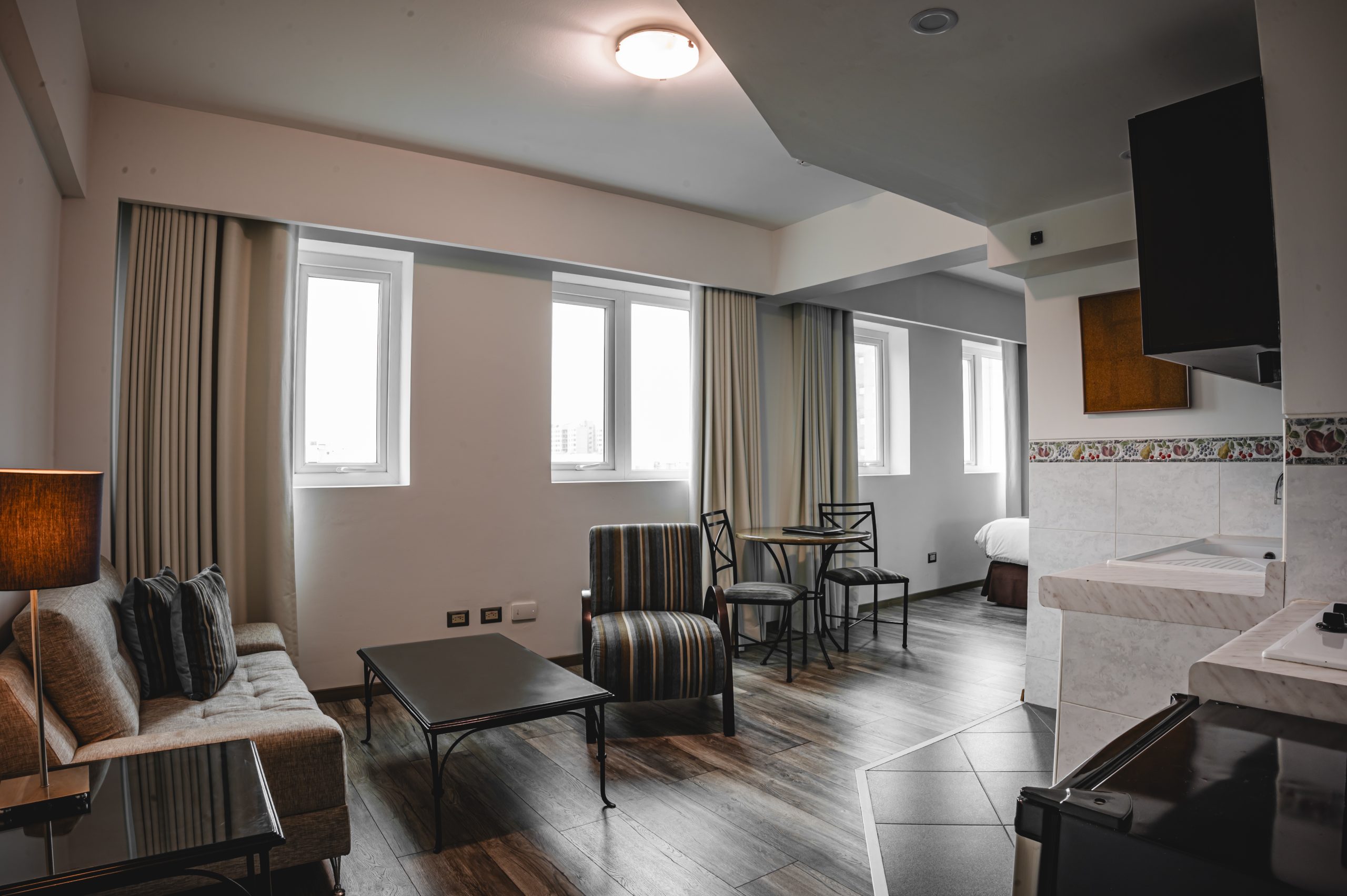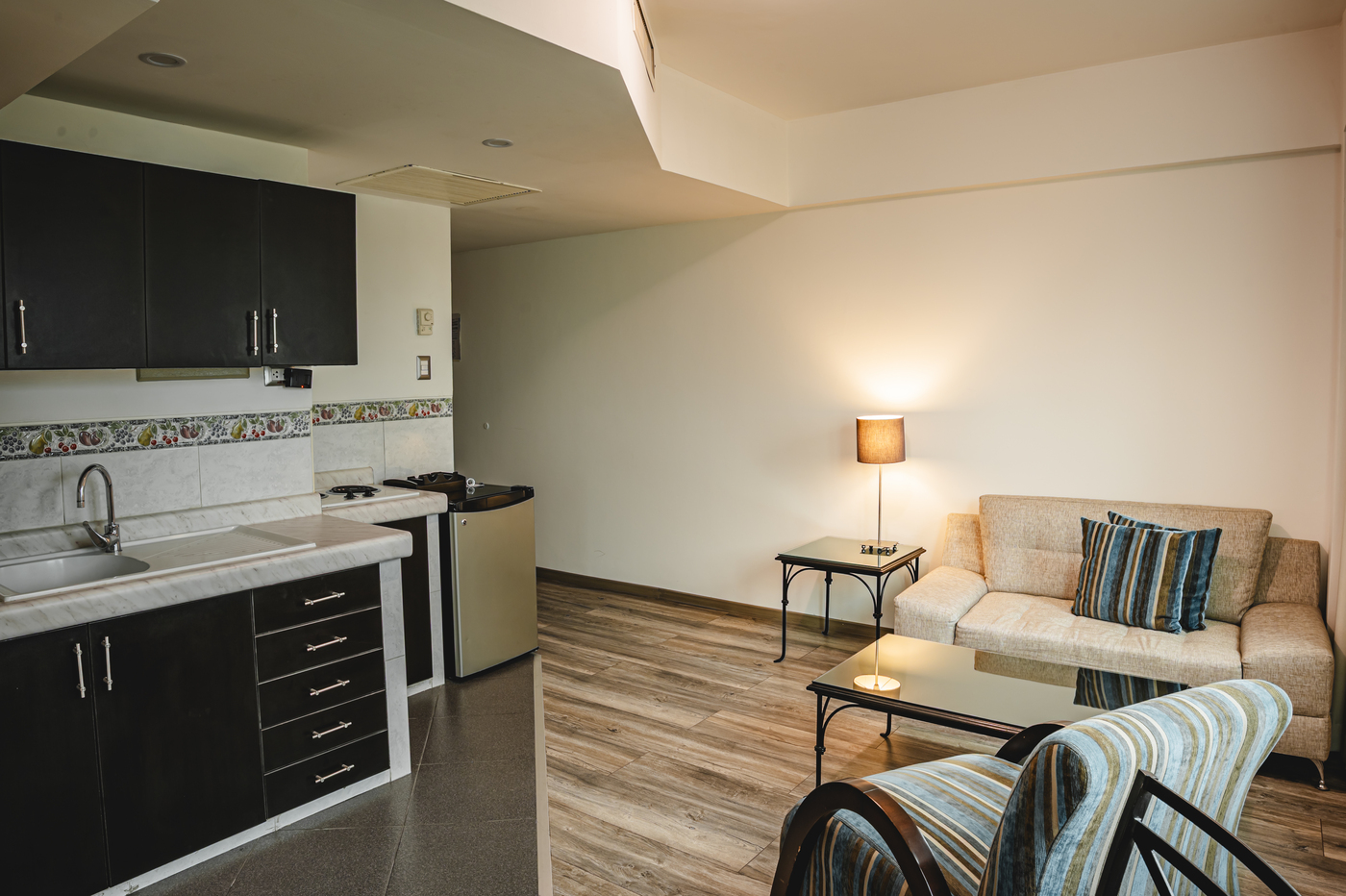 Esta amplia habitación de dos ambientes (50 mts2 ) cuenta con sala, comedor, kitchenette y en otro ambiente el dormitorio con una cama King size; tiene todas las comodidades para una increĆble experiencia.